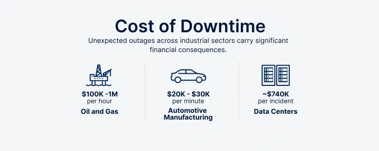 Across industrial sectors, unexpected outages carry significant financial and operational consequences. Independent studies provide a clear picture of the impact: